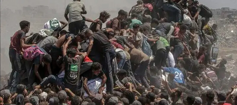 Palestinos suben a un camión de ayuda que entra a Gaza por el cruce de Zikim para conseguir harina, durante una «suspensión táctica» del ejército israelí para permitir el ingreso humanitario. ( World Press Photo 2026 /Saber Nuraldin)