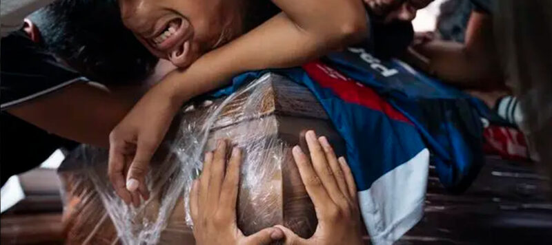 Compañeros lloran a Ismael Arroyo (15), torturado y asesinado por la Fuerza Aérea. En Guayaquil, familiares y vecinos de Las Malvinas acompañaron el cortejo en un multitudinario acto de duelo y protesta. (World Press Photo 2026 /Santiago Arcos /Reuters)