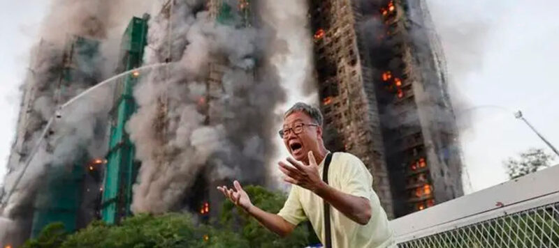 El señor Wong grita angustiado mientras un incendio arrasa su hogar en Tai Po, Hong Kong. Minutos antes habló por última vez con su esposa, atrapada entre las 168 víctimas dentro. (World Press Photo 2026 / Tyrone Siu)