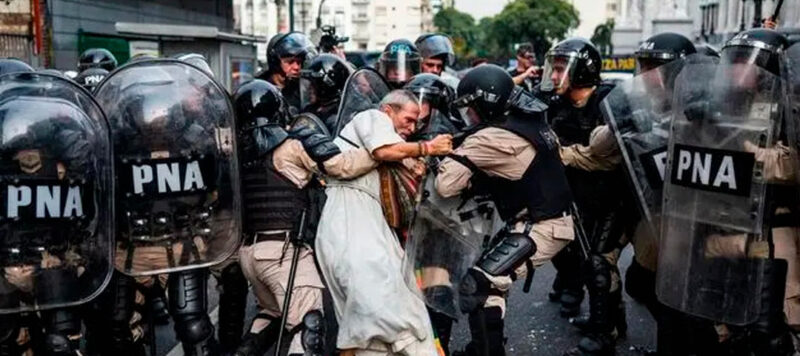La policía detiene al padre Jorge «Chueco» Romero durante una protesta de jubilados en Buenos Aires, Argentina, durante una de las manifestaciones semanales contra la congelación de las pensiones y los recortes a la cobertura médica esencial. (World Press Photo 2026 / Tadeo Bourbon):