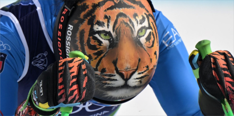 Hay una ferocidad silenciosa en la mirada verde del rostro de tigre impreso en la parte superior del casco de la esquiadora italiana Federica Brignone, como se captura en una foto de la atleta entrenando para la prueba de descenso femenino el primer día de los Juegos Olímpicos de Invierno en el Centro de Esquí Alpino Tofane en Cortina d’Ampezzo. El afán de fusionar la propia identidad y la determinación de espíritu con el poder primordial de un tigre indomable fue puesto a prueba hace casi dos siglos por el artista romántico italiano Francesco Hayez, cuya extraordinaria pintura de 1831, Autoritratto con tigre e leone (Autorretrato con tigre y león), se puede ver en Milán, en el Museo Poldi Pezzoli.