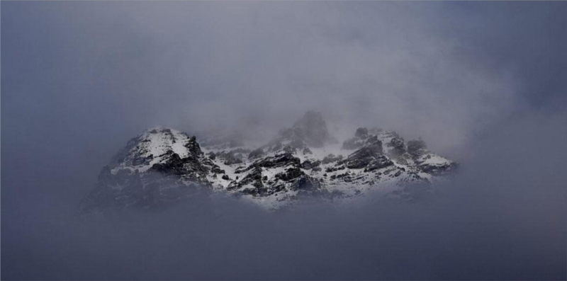 Una foto etérea de picos nevados hacia el Paso de Stelvio, asomándose a través de una grieta en la niebla helada. Antes de una carrera de esquí alpino masculino en el quinto día de los Juegos en Bormio, Italia, tiene una cualidad decididamente mística, de mundo flotante. La brumosa reflexión de la imagen sobre la inmanencia y la quietud refleja la mentalidad de un paisaje tardío del artista japonés de ukiyo-e del siglo XIX , Utagawa Hiroshige, Las montañas Kiso en la nieve , uno de los tres trípticos sobre el tema de setsugetsuka (o «nieve, luna y flores»), que realizó un año antes de su muerte. Aquí, las montañas monumentales casi se disuelven ante nuestros ojos en una meditación sobre algo misterioso que yace más allá.