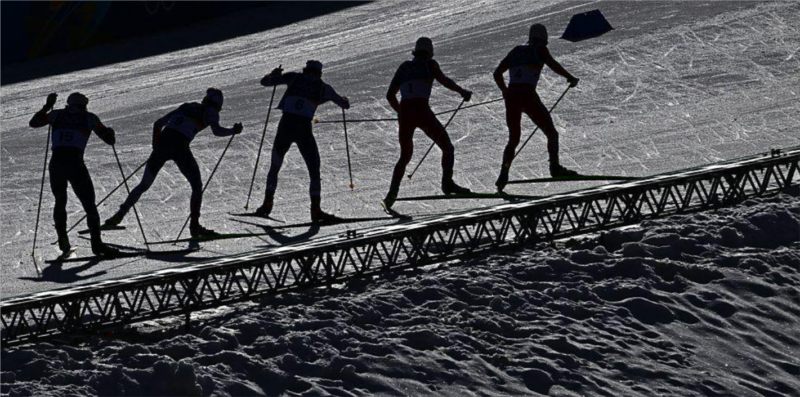 Las sombras tienen una forma de mecanizar el movimiento. Anonimizada en la oscuridad, una figura atrapada en la sombra a menudo parece esencializada en una forma arquetípica: un cuerpo de fronteras que, de alguna manera, las trasciende. Tal es el poder de una foto multinacional de atletas tomada el tercer día de los Juegos en el Estadio de Esquí de Fondo Tesero en Lago di Tesero (Val di Fiemme). Sombras que proyectan sombras, estas figuras austeras pero indistintas recuerdan los contornos de los experimentos futuristas de despojar la fuerza de la forma. En la pintura de 1913 del modernista italiano Giacomo Balla, Velocidad abstracta , la oscuridad y la luz son engranajes de una máquina cromática que se mueve más allá del movimiento.