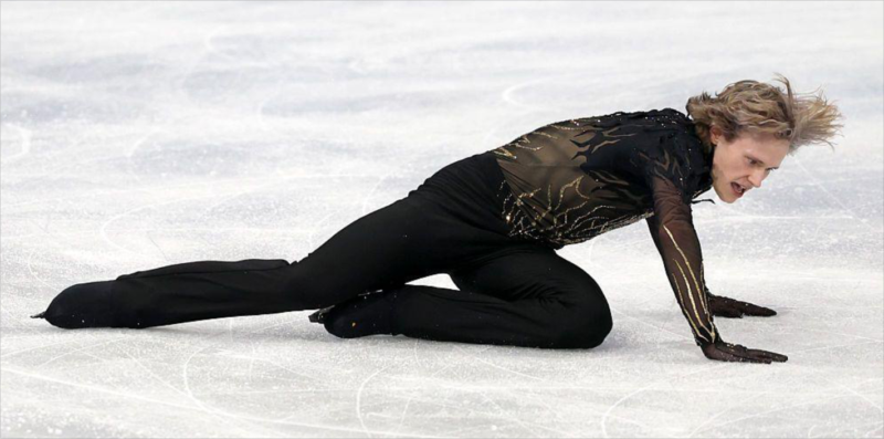 Hay un poder centrípeto en la mirada recortada de la patinadora artística alemana Annika Hocke, con la cabeza a centímetros del hielo, mirando a través de la estrecha abertura triangular de las piernas cruzadas de su compañero de patinaje, Robert Kunkel, mientras él la hace girar rápidamente con los brazos extendidos en un movimiento peligroso conocido como la «espiral de la muerte» en el día 11 de los Juegos. El aislamiento de los ojos como centro implosivo de la imagen, capturado milagrosamente por el fotógrafo, se hace eco del vórtice visual de contemplar el corazón de un fenómeno olvidado del siglo XVIII de las llamadas » miniaturas de ojos » en Inglaterra.