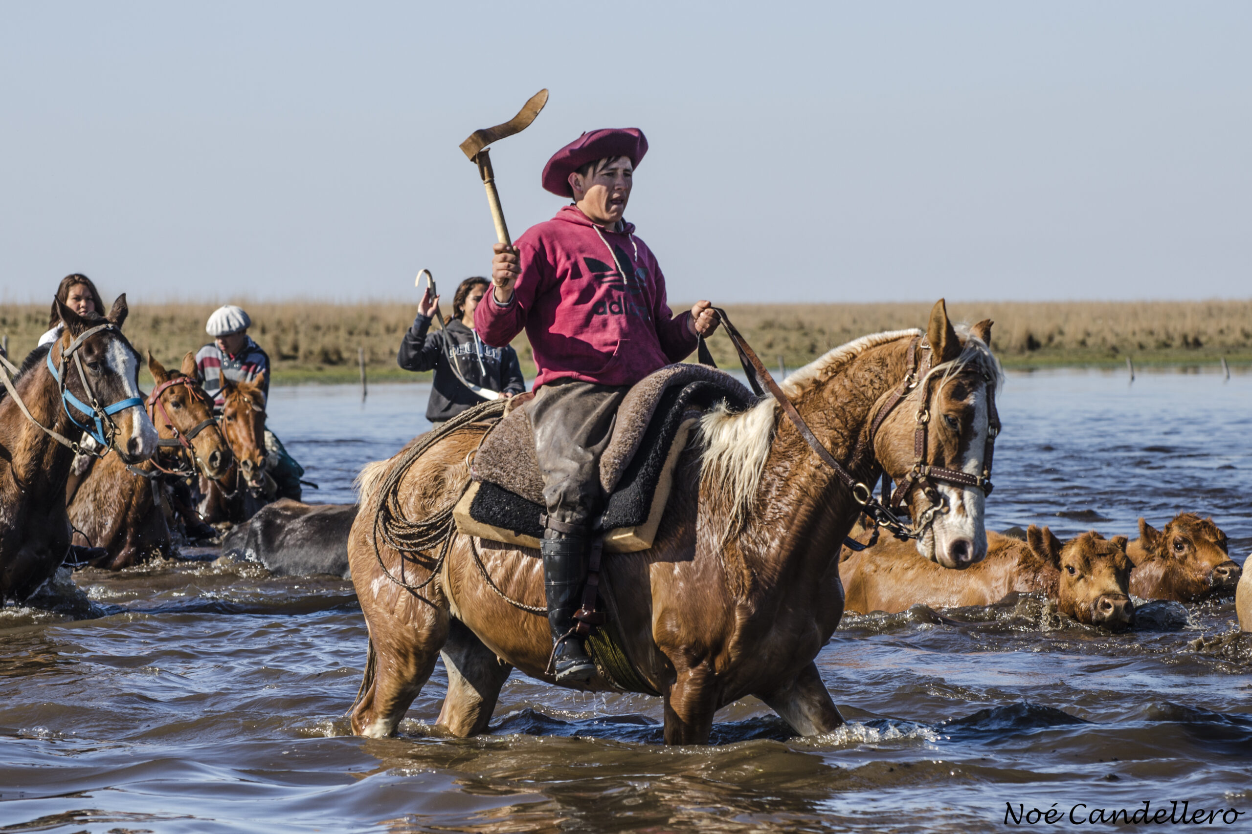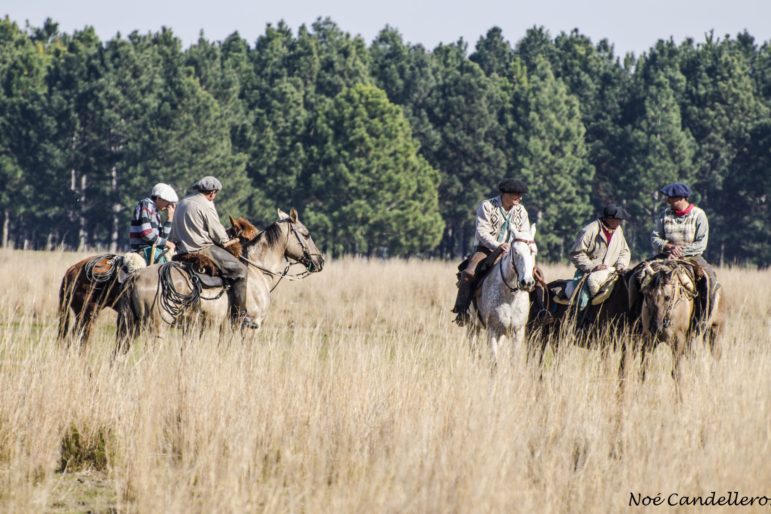 Sus caballos indispensables para ese trabajo, esbeltos, hermosos, nobles, que tras las caricias de sus jinetes tranquilamente dejan colocar sus monturas, cinchas, arneses. Ellos vestidos cómodamente con sus bombachas, guardamontes, polainas o sombreros de alas anchas, cintos rastras y pañuelos.