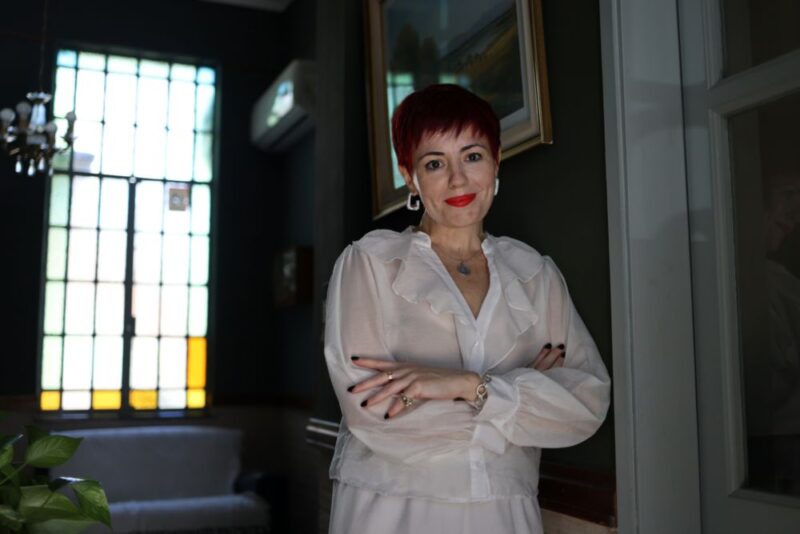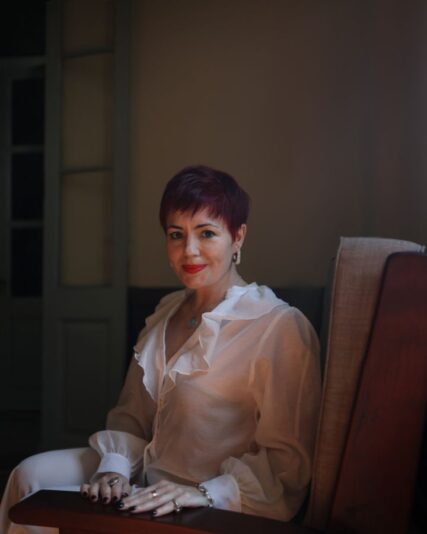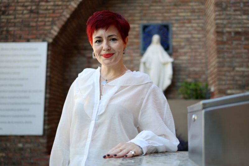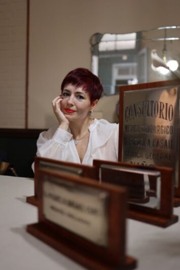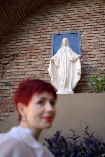Relata que le gusta bailar y que hizo danza clásica durante muchos años. Que le atrae todo lo que implique estética, que no puede quedarse quieta mucho tiempo y que se siente una rescatista permanente de animales. Su gato Salvador llegó a ella tras la muerte de un perro al que quería mucho. “Apareció y nos eligió”. Cuenta que rescató a tres palomas pequeñas, las alimentó y actualmente cuando llega al estudio las llama y se acercan. Y reza todo el tiempo. “Yo agradezco, siempre agradezco, por lo que tengo, por lo que veo al ir caminando. Es la presencia constante de Dios en mi vida”.